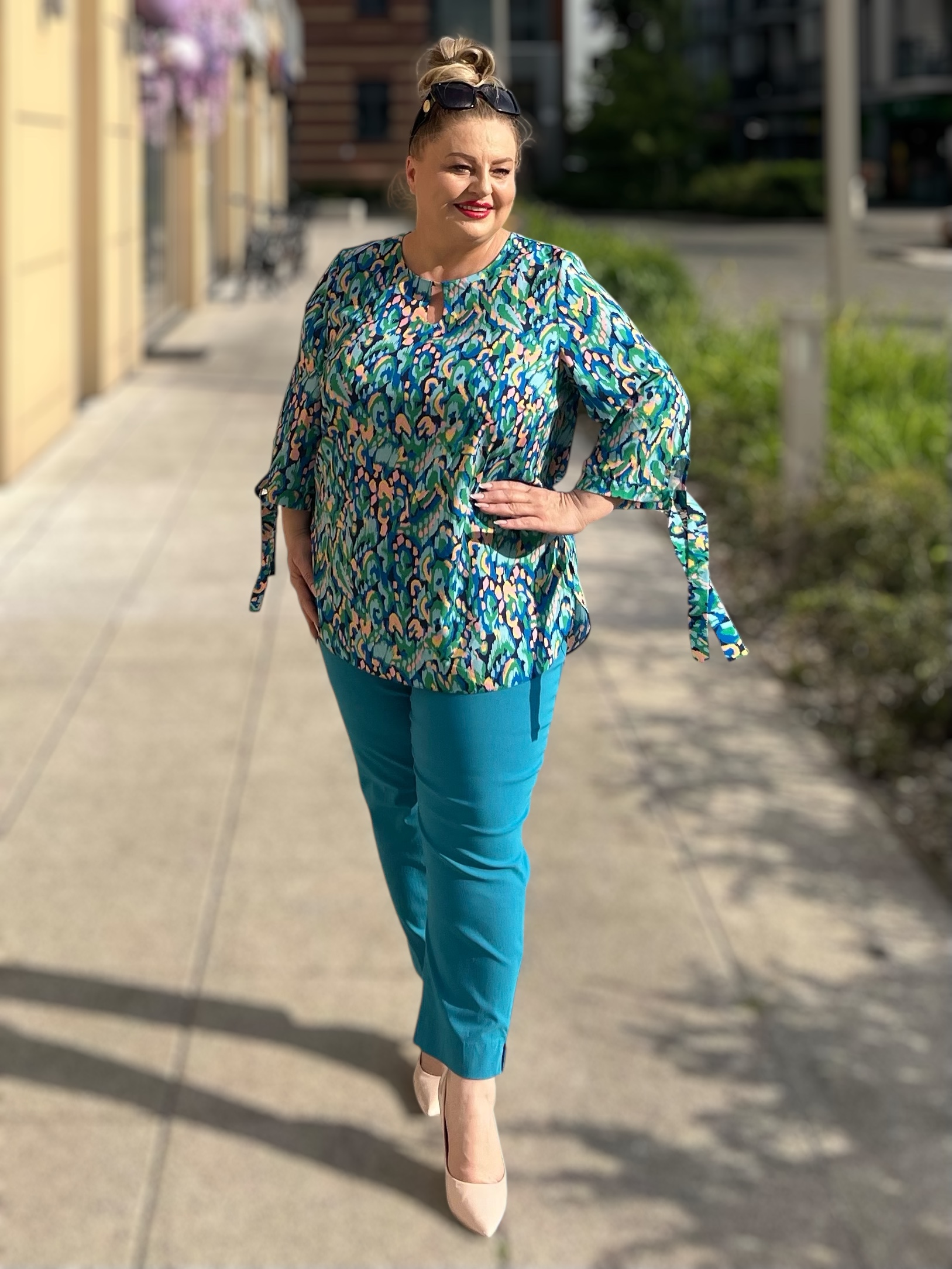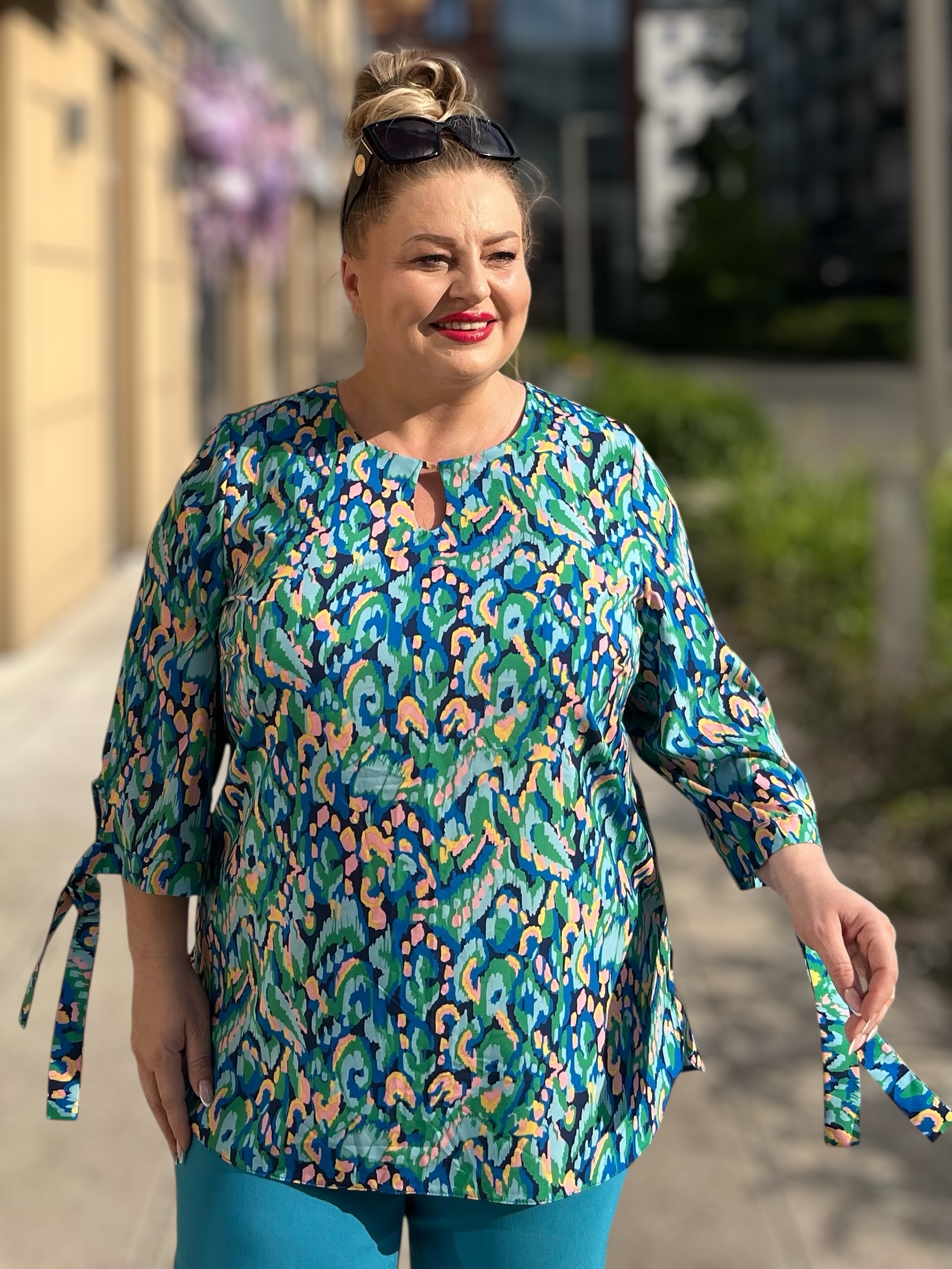 Wyróżnia się oryginalnym, kolorowym wzorem, który ożywia każdą stylizację, oraz modnym krojem z wiązaniami przy rękawach i niewielkim wycięciem przy dekolcie. Bluzka damska plus size Kalina sprawdzi się idealnie zarówno do pracy, jak i na spotkania towarzyskie czy rodzinne wyjścia.
