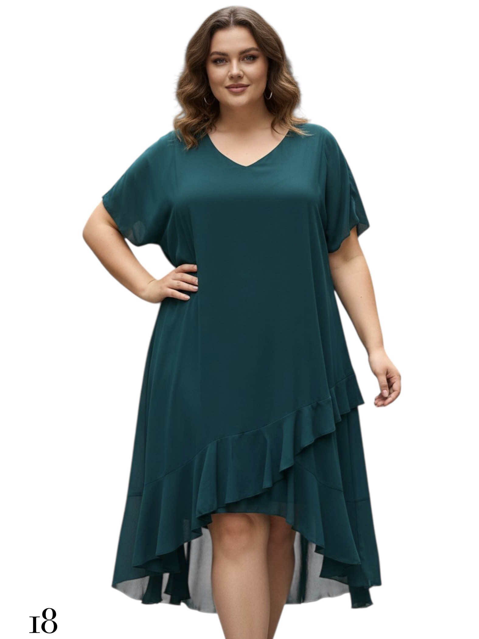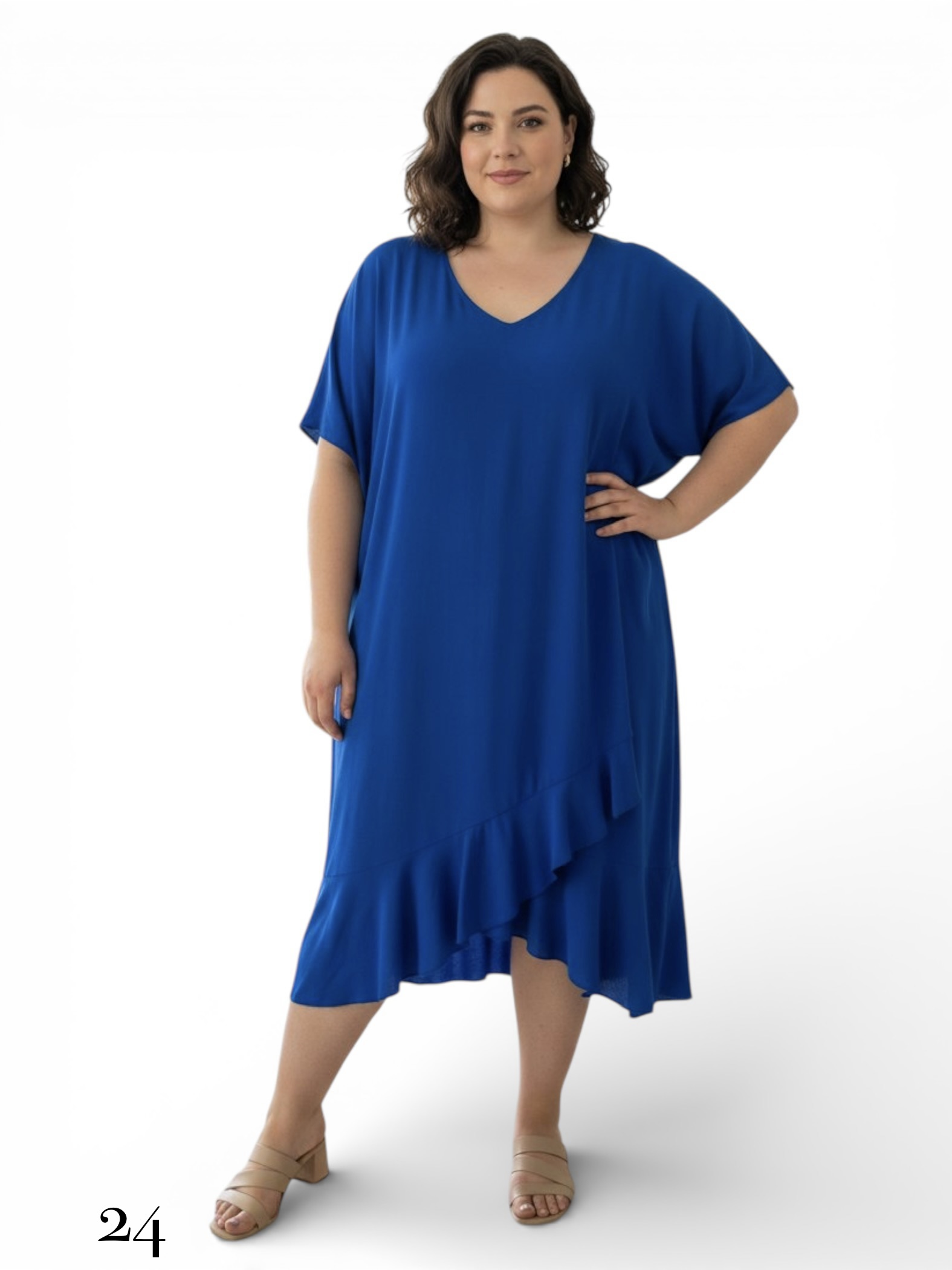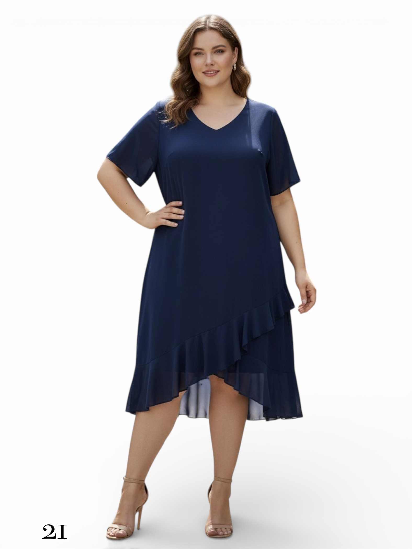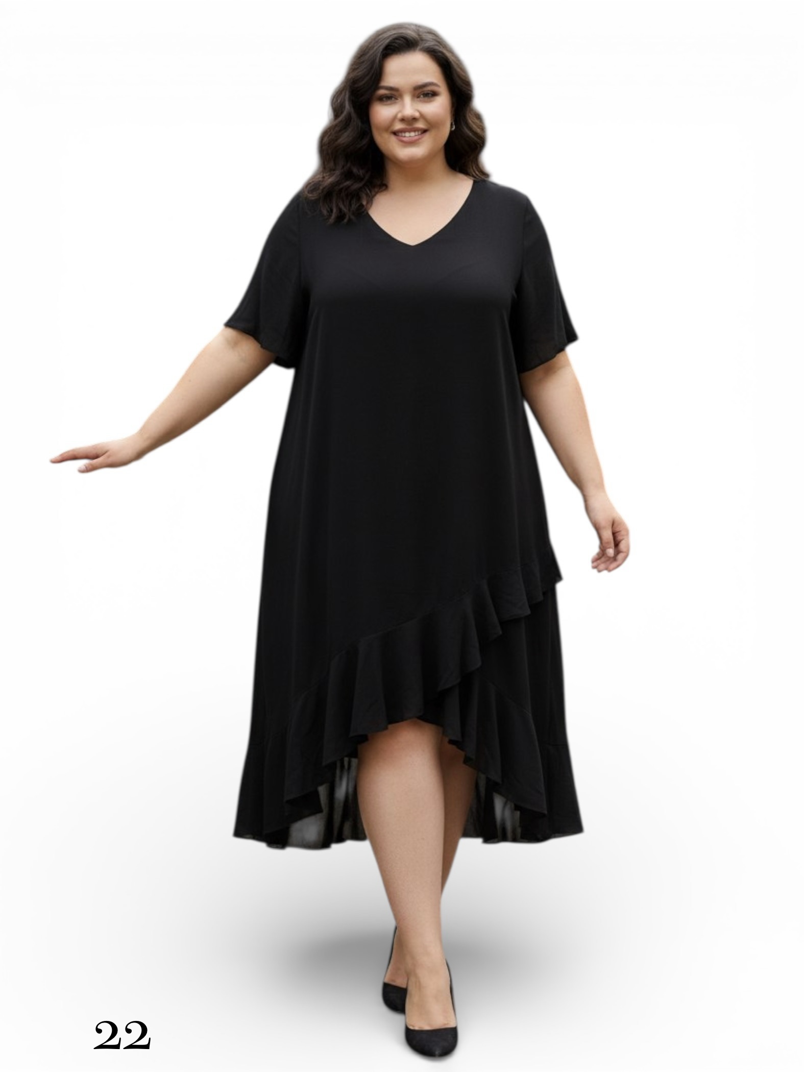 - Sukienka o kroju asymetrycznym, zakończona na dole delikatnymi falbanami.