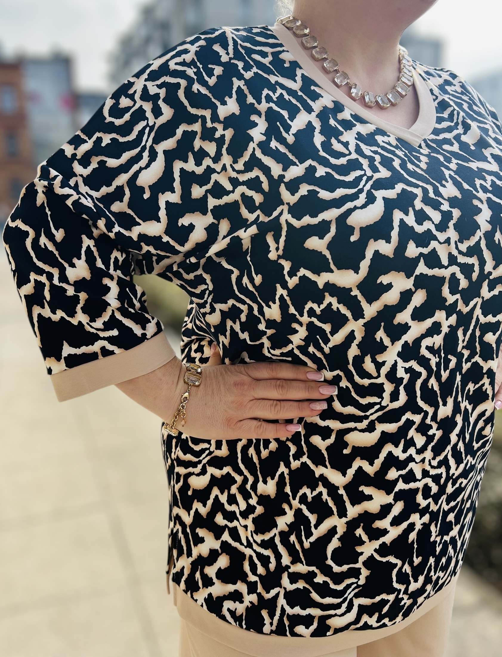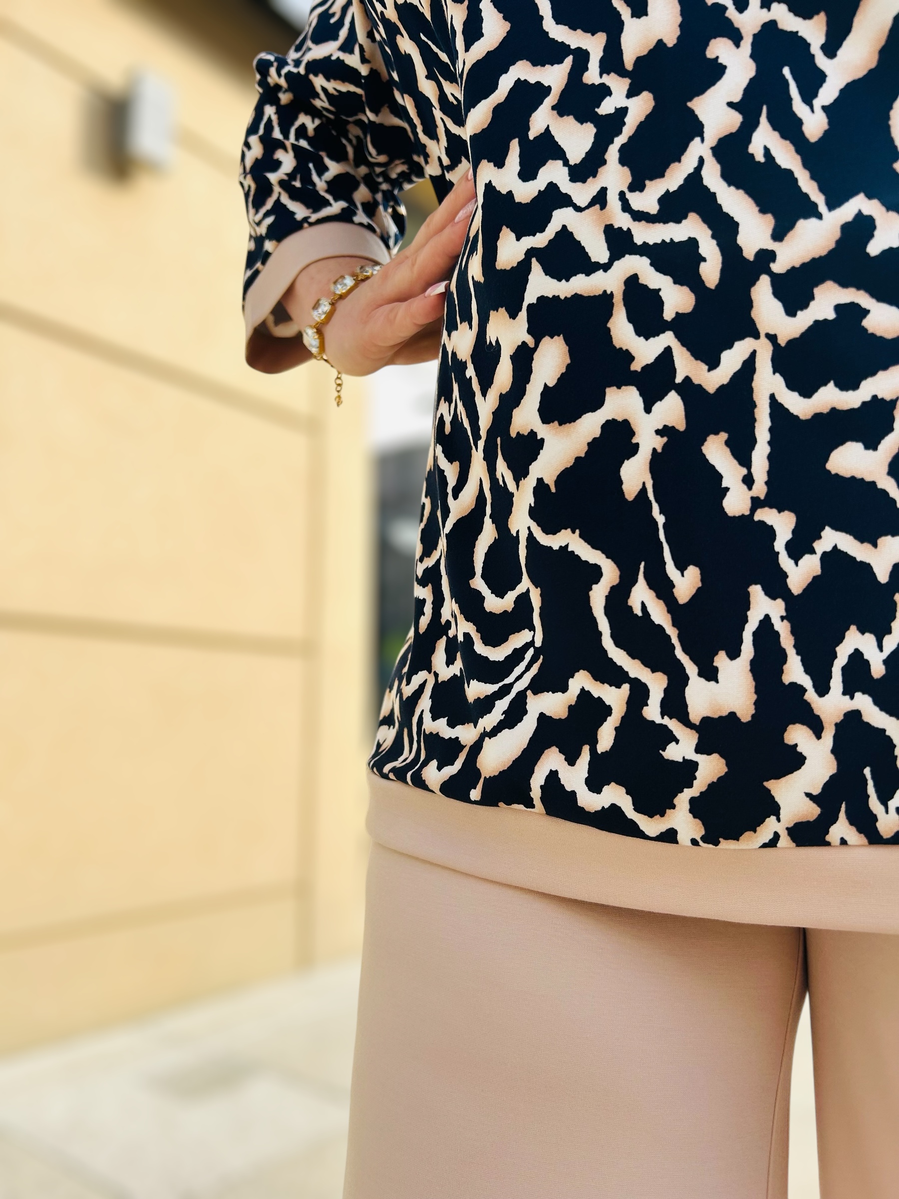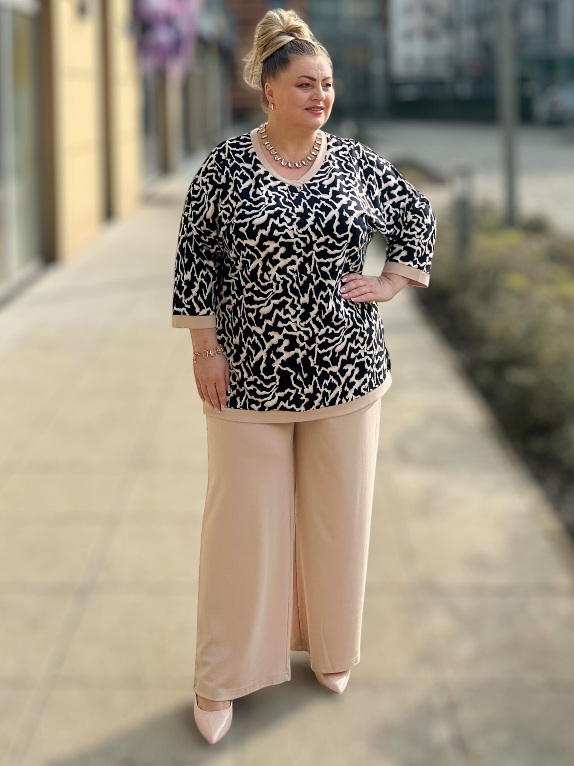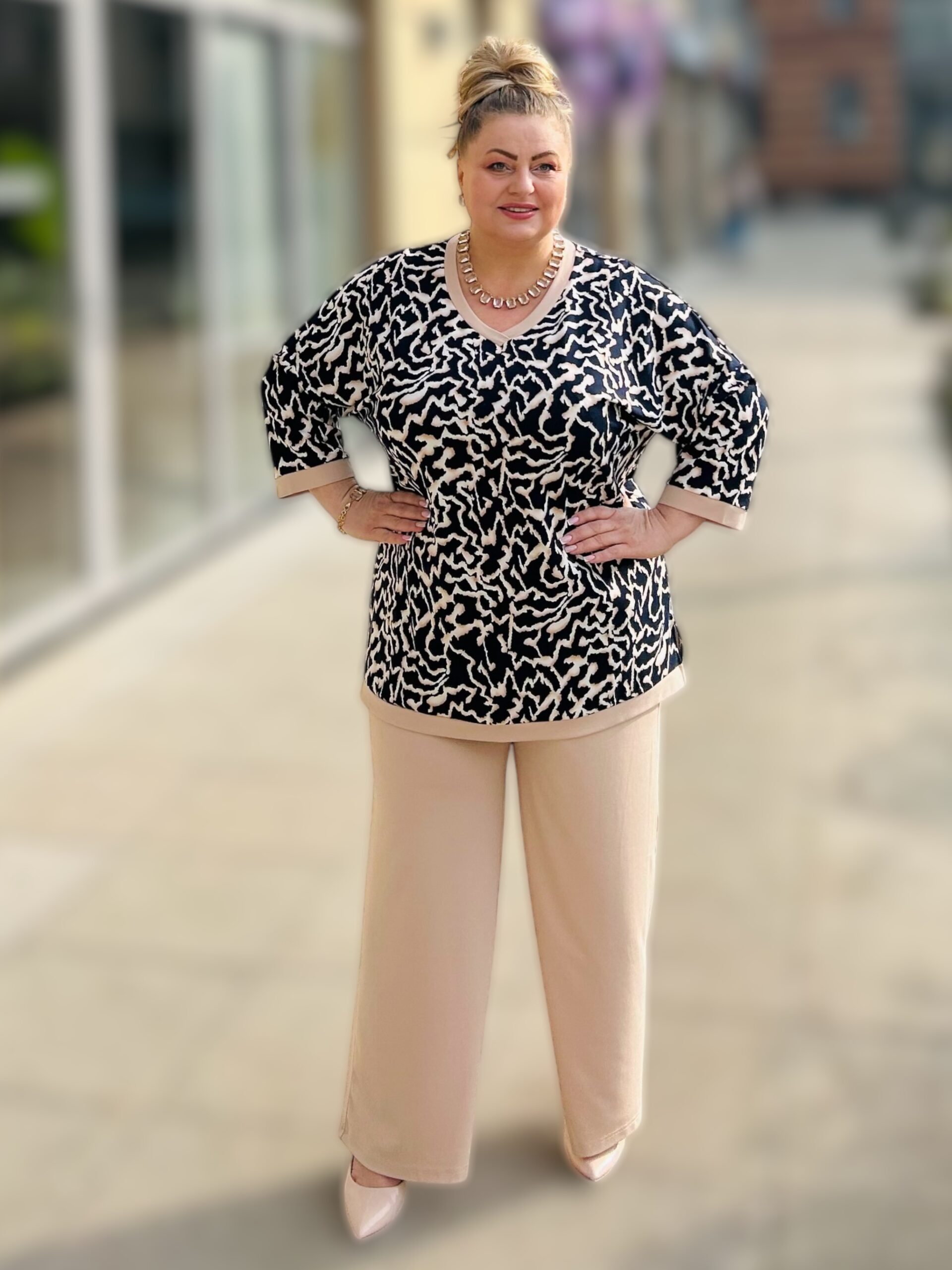 | 48 | obwód w biuście 105-115 cm, obwód w pasie 110-120 cm, obwód w biodrach 110-120 cm, długość bluzki 75 cm, długość rękawa 45 cm, biceps do 48 cm, długość nogawki wew. 73 cm, długość nogawki zew. 105 cm, Szerokość nogawki na dole 30×2 cm, szerokość udo 68 cm |