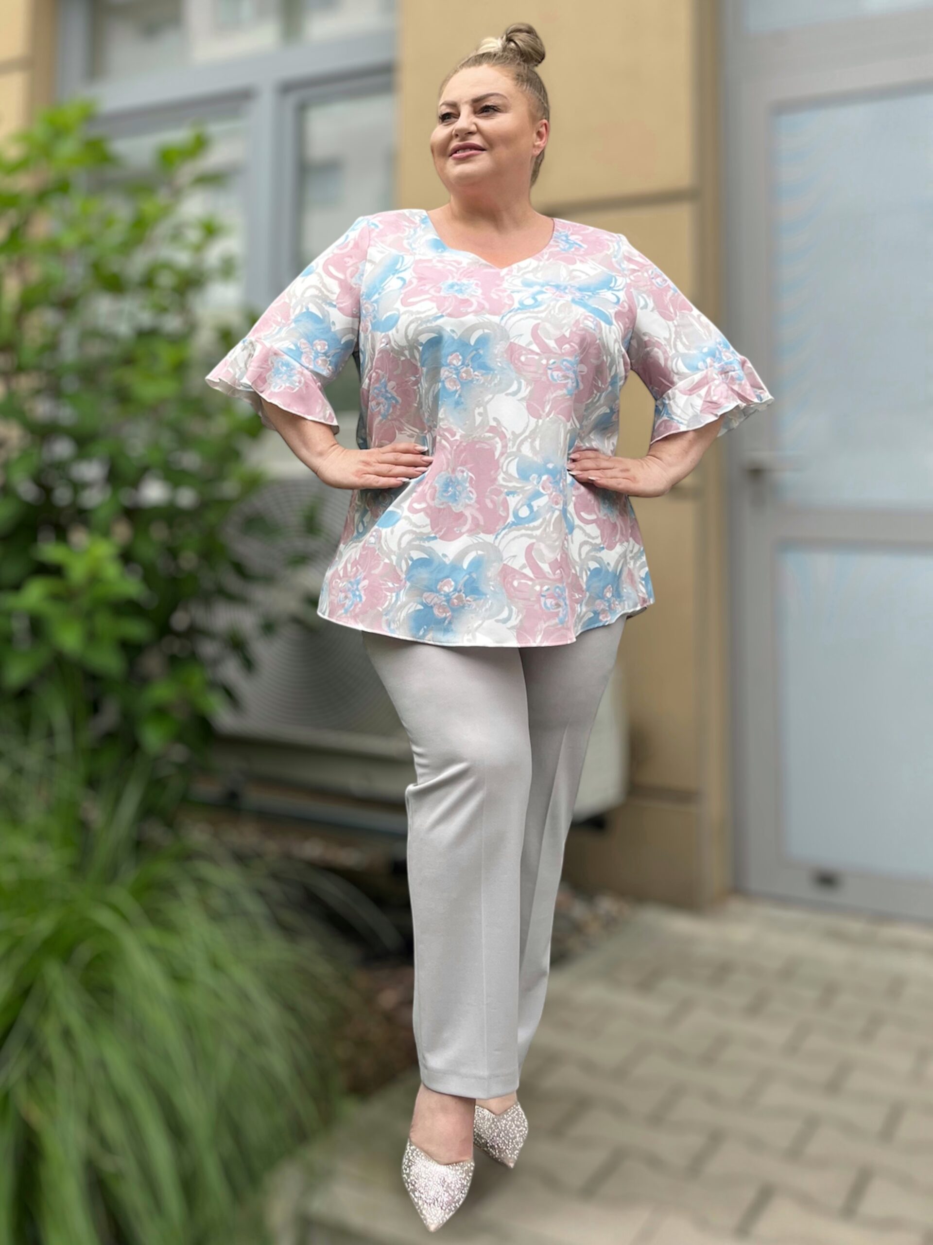 Wymiary modelki: wzrost 159 cm, biust 128 cm, pas 115 cm, biodra 134 cm.