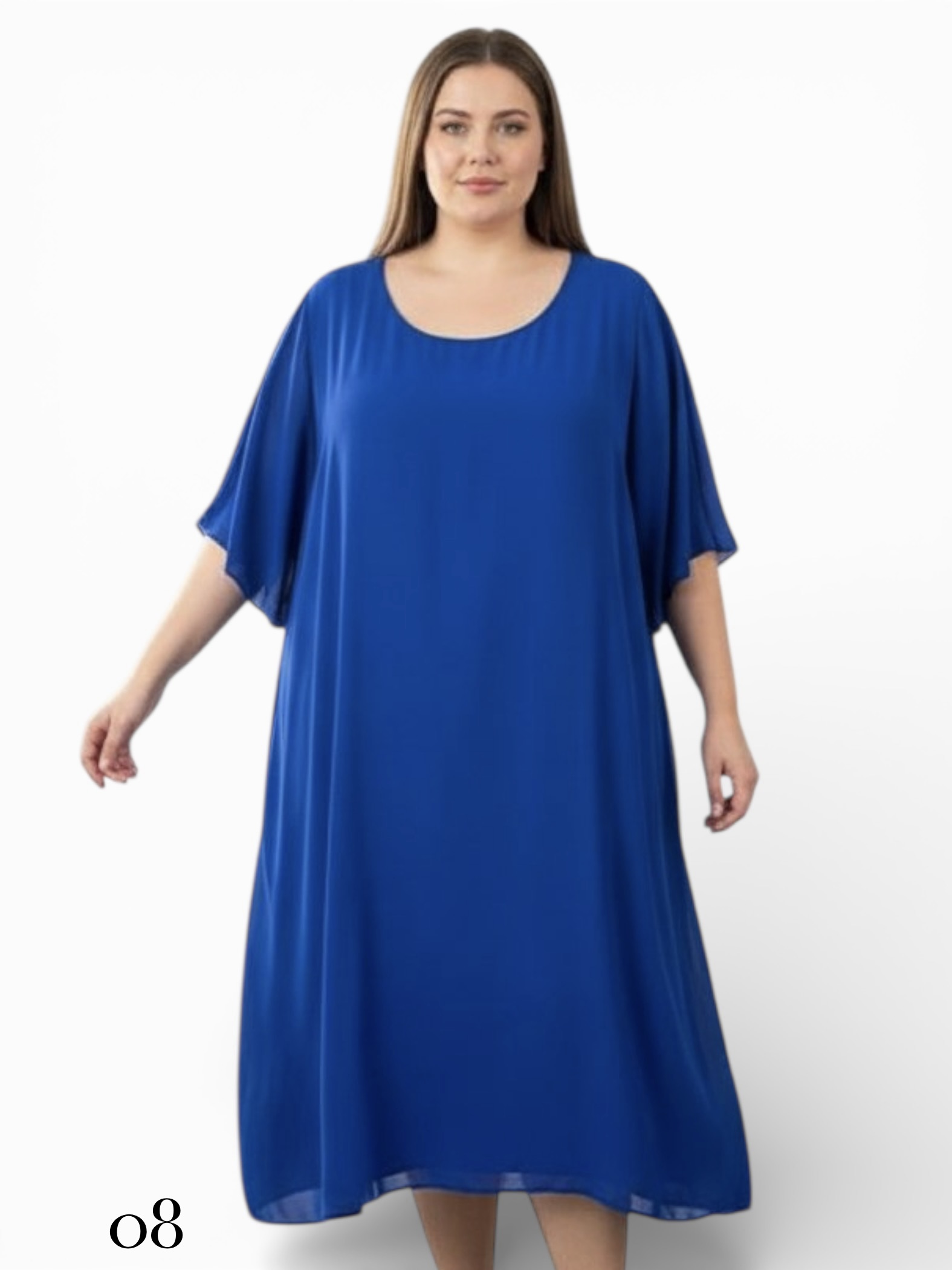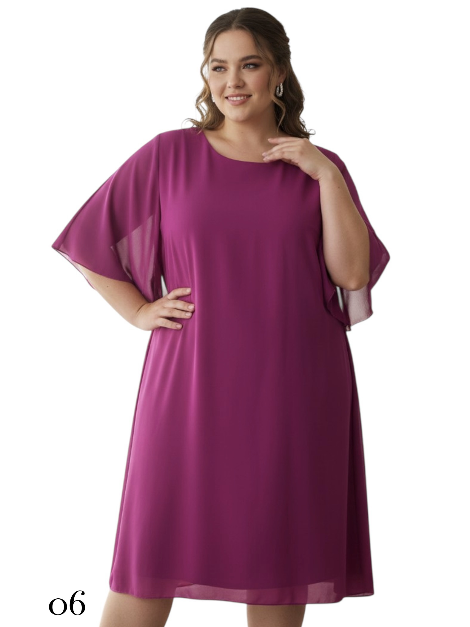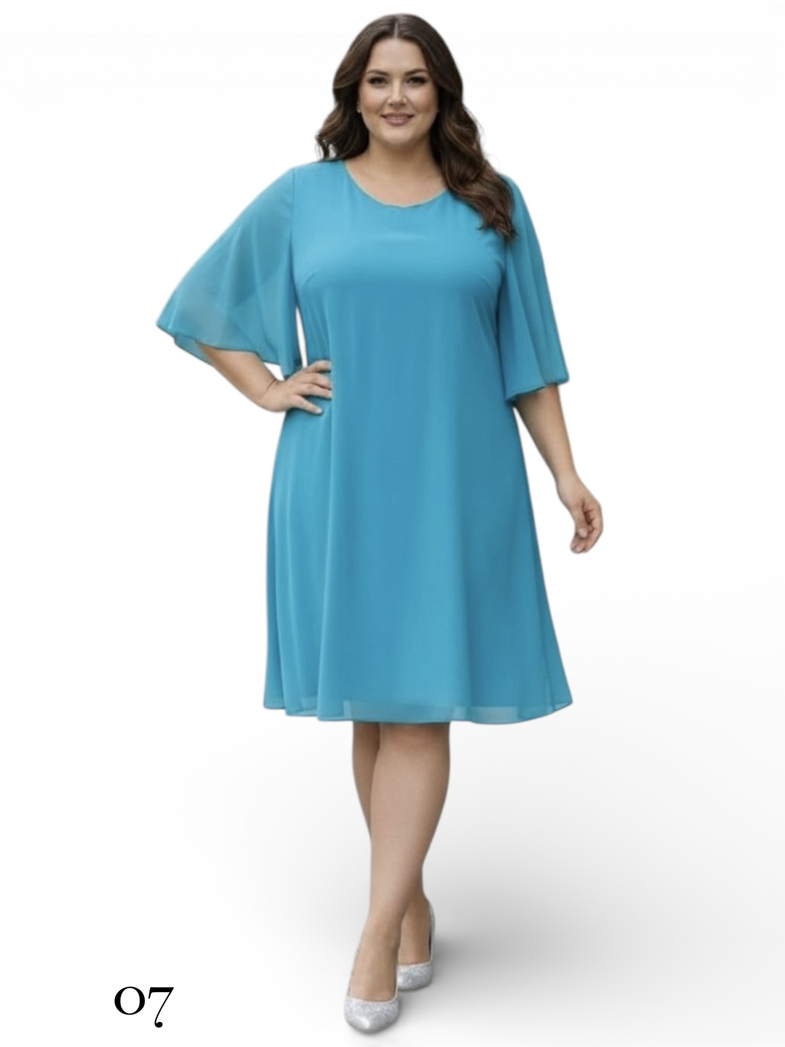 Swobodny, trapezowy fason sukienki pięknie układa się na sylwetce, zapewniając pełen komfort i swobodę ruchów przez cały dzień. Uroku dodają jej zwiewne, motylkowe rękawy, które subtelnie osłaniają ramiona i wprowadzają element lekkości. Wykonana z lekkiej, szyfonowej tkaniny na podszewce, sprawdzi się doskonale zarówno na co dzień, jak i na specjalne okazje. To idealna propozycja dla kobiet w dużych rozmiarach, które cenią sobie wyrafinowany styl połączony z niezrównaną wygodą.