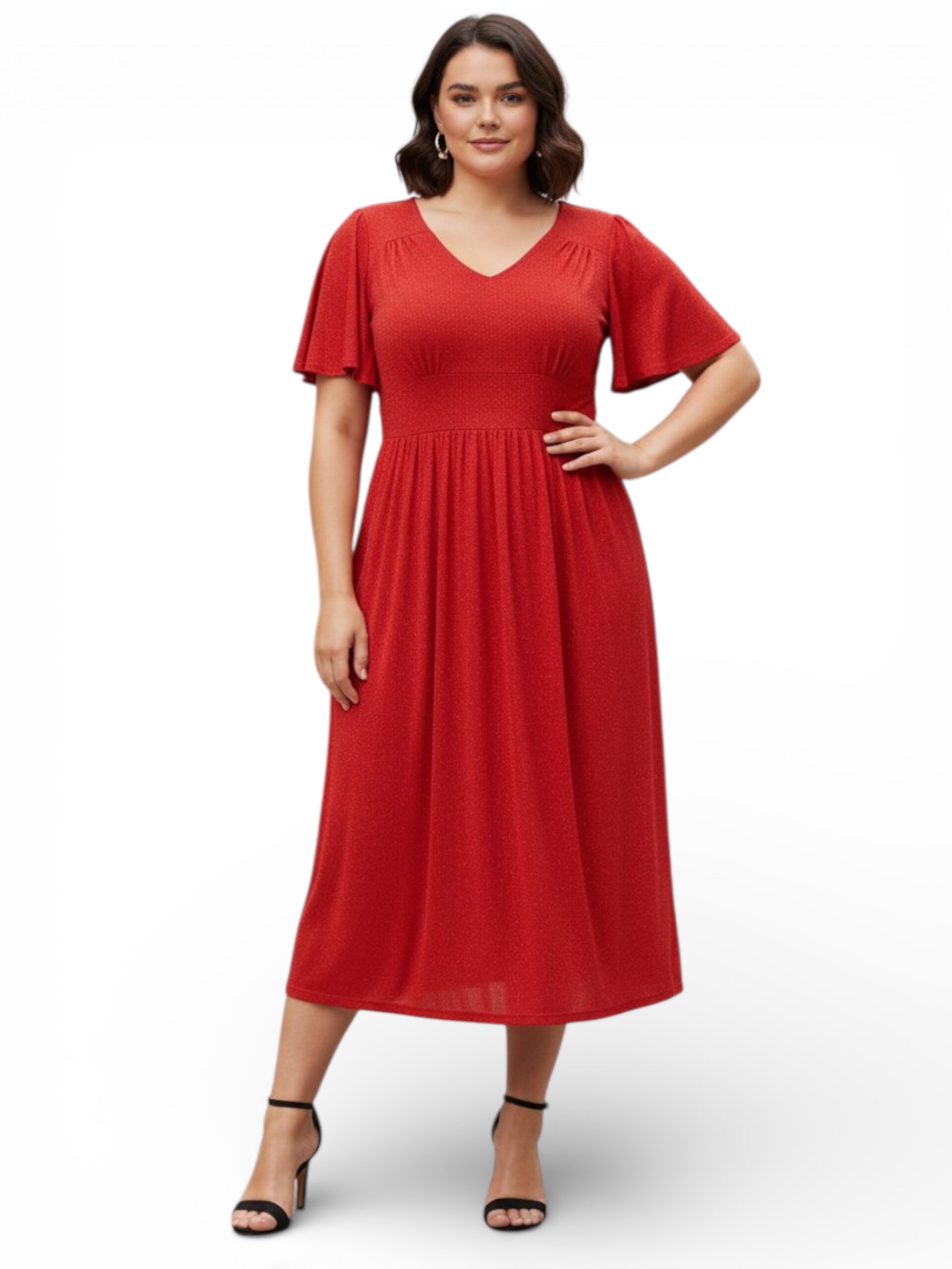 Odkryj sukienkę w dużych rozmiarach, w której poczujesz się zjawiskowo i niezwykle kobieco. Sukienka w nasyconym, czerwonym kolorze została ozdobiona subtelną, mieniącą się nitką, która dodaje jej wyjątkowego blasku. Przemyślany fason z dekoltem w serek oraz odcięciem pod biustem pięknie podkreśla atuty sylwetki. Zwiewne, motylkowe rękawki dodają całości lekkości i zapewniają komfort noszenia. Długość midi jest zarówno elegancka, jak i uniwersalna, idealnie komponując się z różnym obuwiem. To doskonały wybór na specjalne okazje, w którym połączono wygodę z ponadczasowym szykiem.