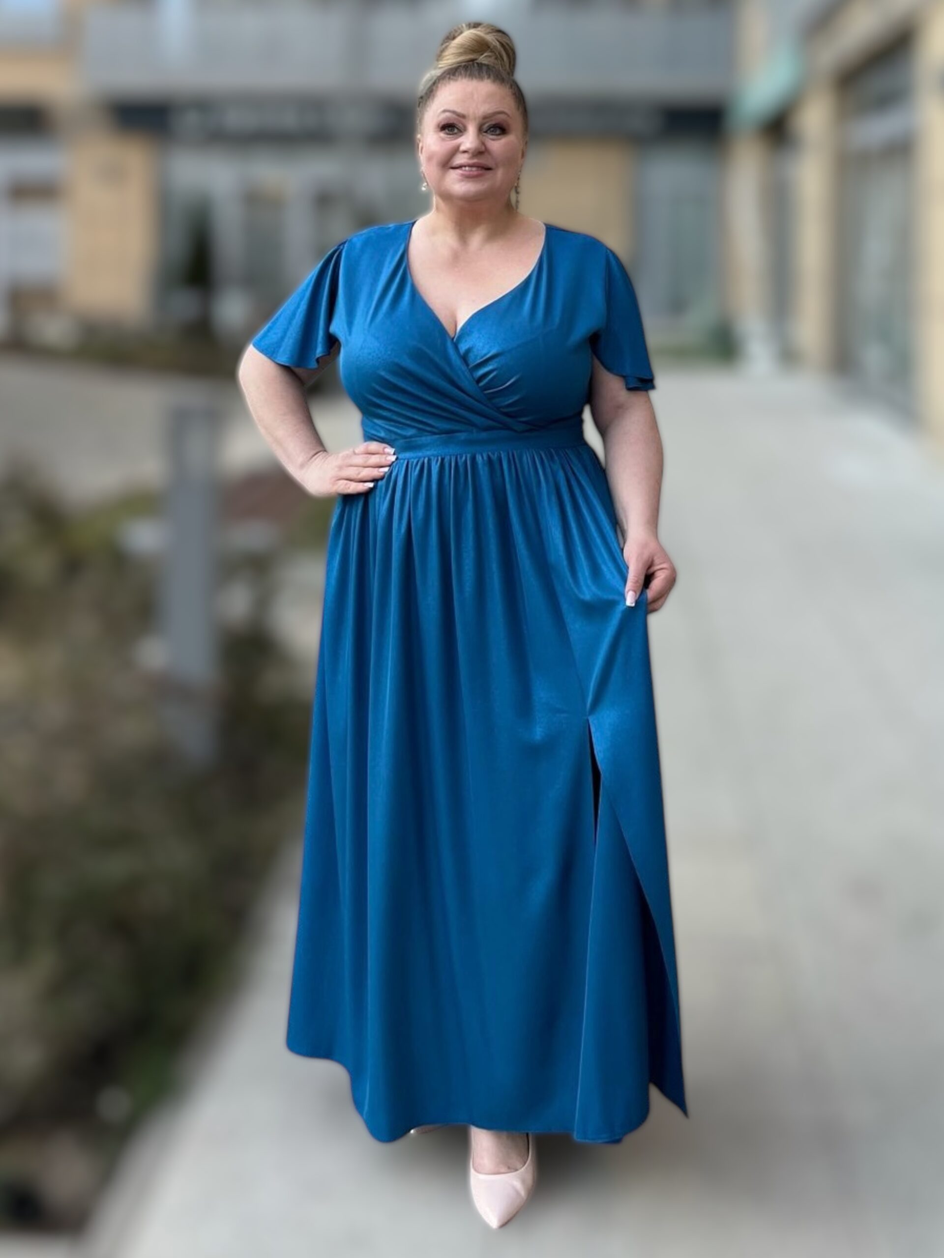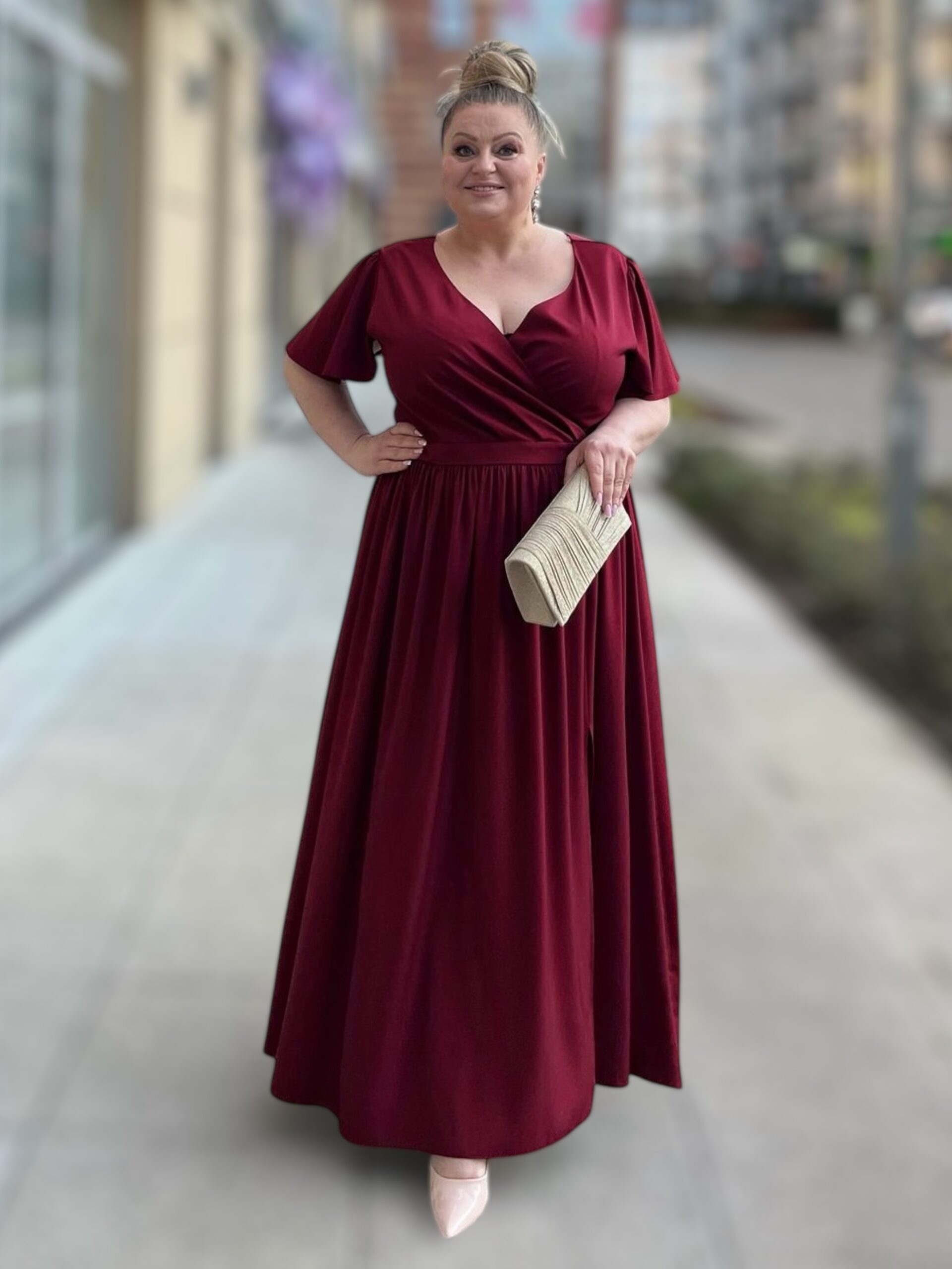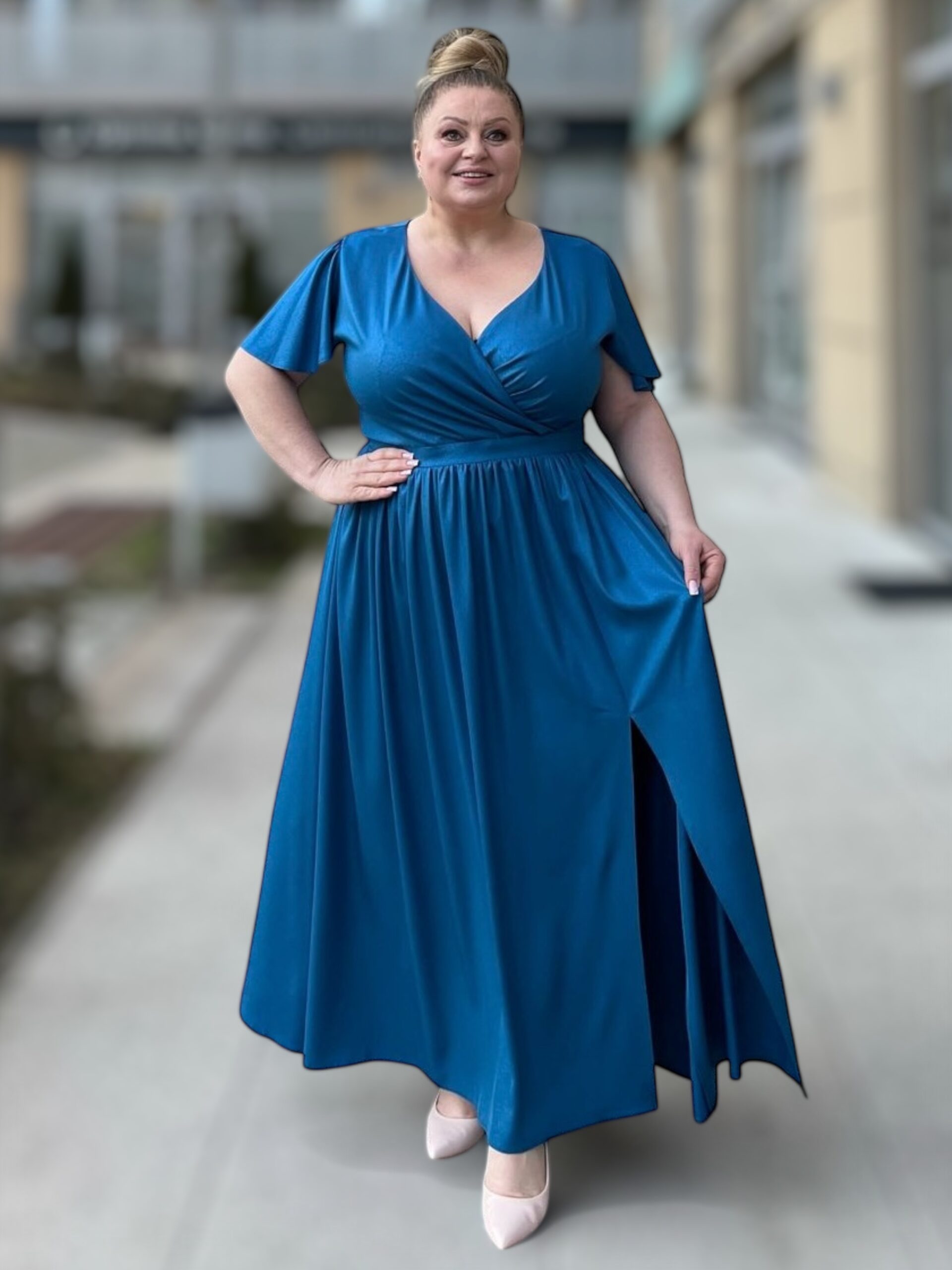 Rozkloszowany dół sukienki z subtelnym rozcięciem z boku gwarantuje swobodę ruchów i optycznie wysmukla nogi. Krótkie rękawki dodają lekkości, czyniąc ją idealną zarówno na wieczorne wyjścia, jak i uroczystości rodzinne. Sukienka dostępna jest w trzech eleganckich kolorach: bordo, chabrowym i zielonym. Idealna dla sylwetek XXL, optycznie wyszczupla sylwetkę i gwarantuje swobodę.