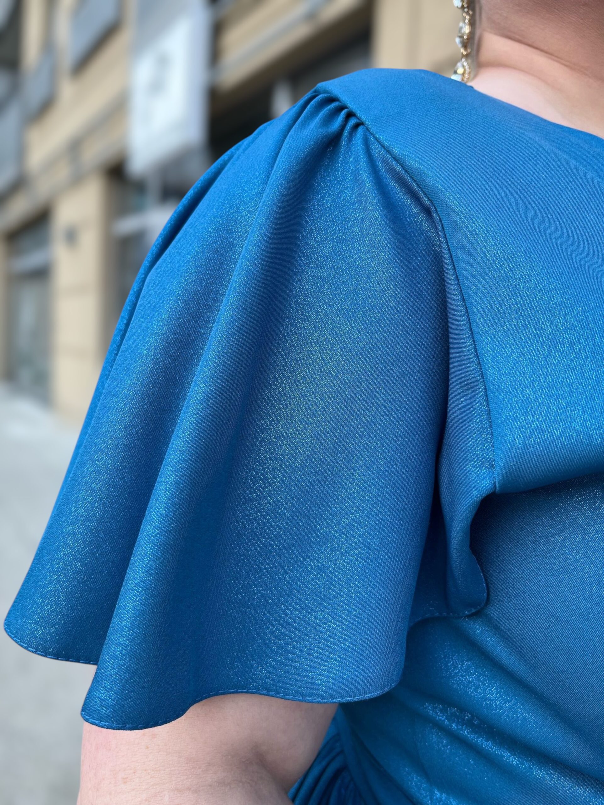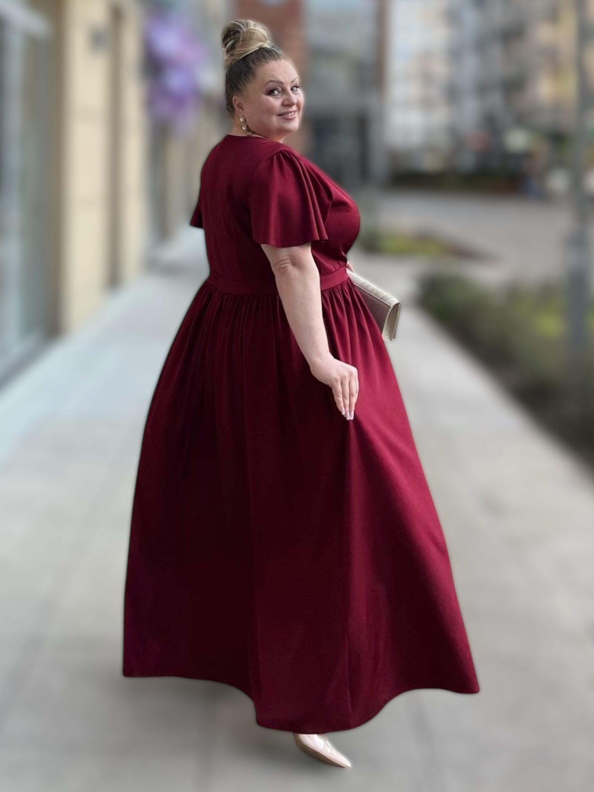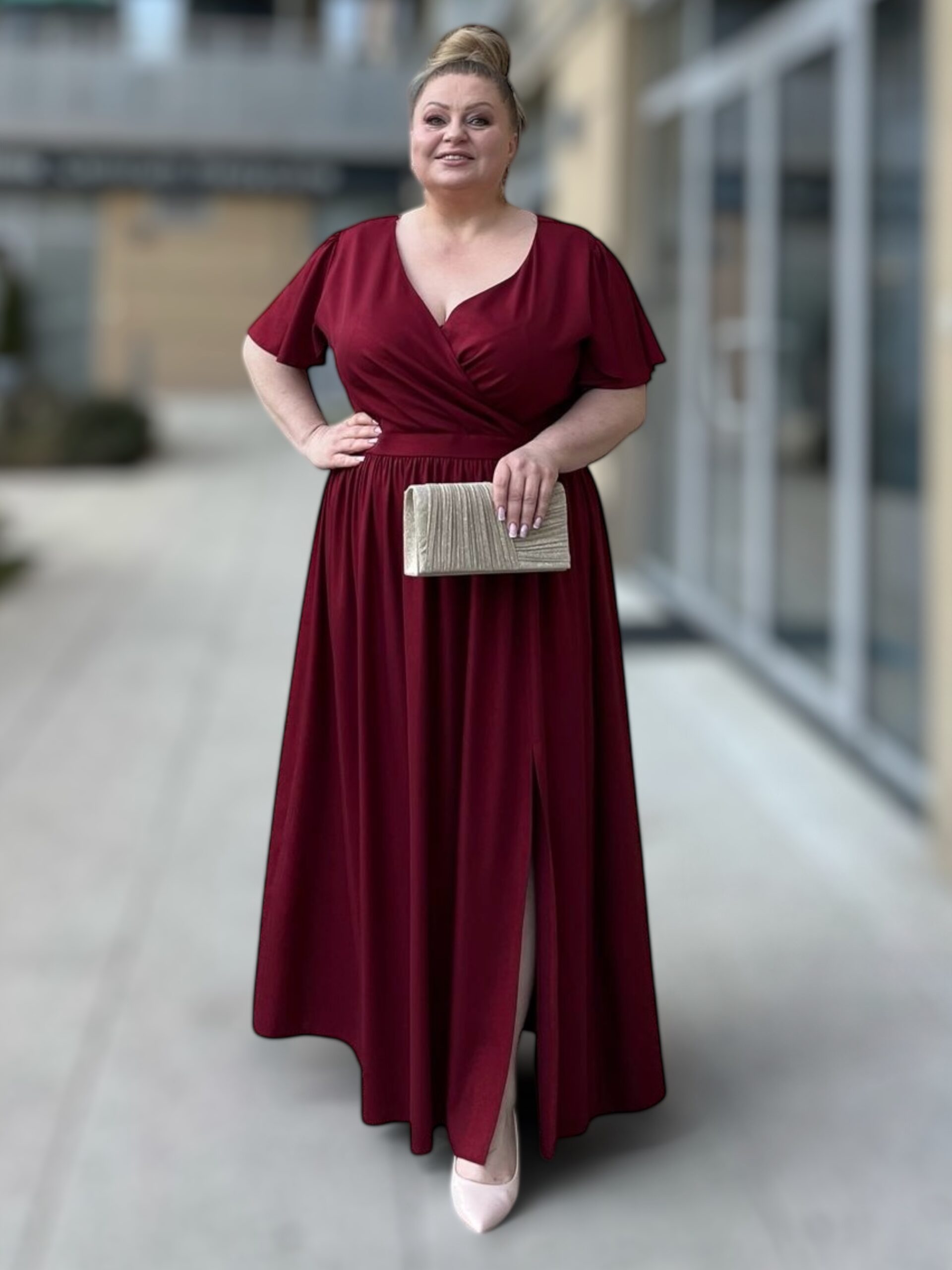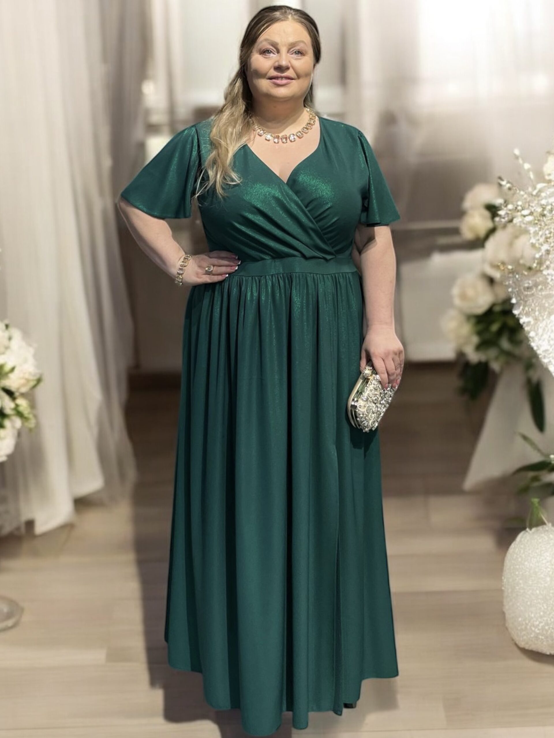 Rozkloszowany dół sukienki z subtelnym rozcięciem z boku gwarantuje swobodę ruchów i optycznie wysmukla nogi. Krótkie rękawki dodają lekkości, czyniąc ją idealną zarówno na wieczorne wyjścia, jak i uroczystości rodzinne. Sukienka dostępna jest w trzech eleganckich kolorach: bordo, chabrowym i zielonym. Idealna dla sylwetek XXL, optycznie wyszczupla sylwetkę i gwarantuje swobodę.