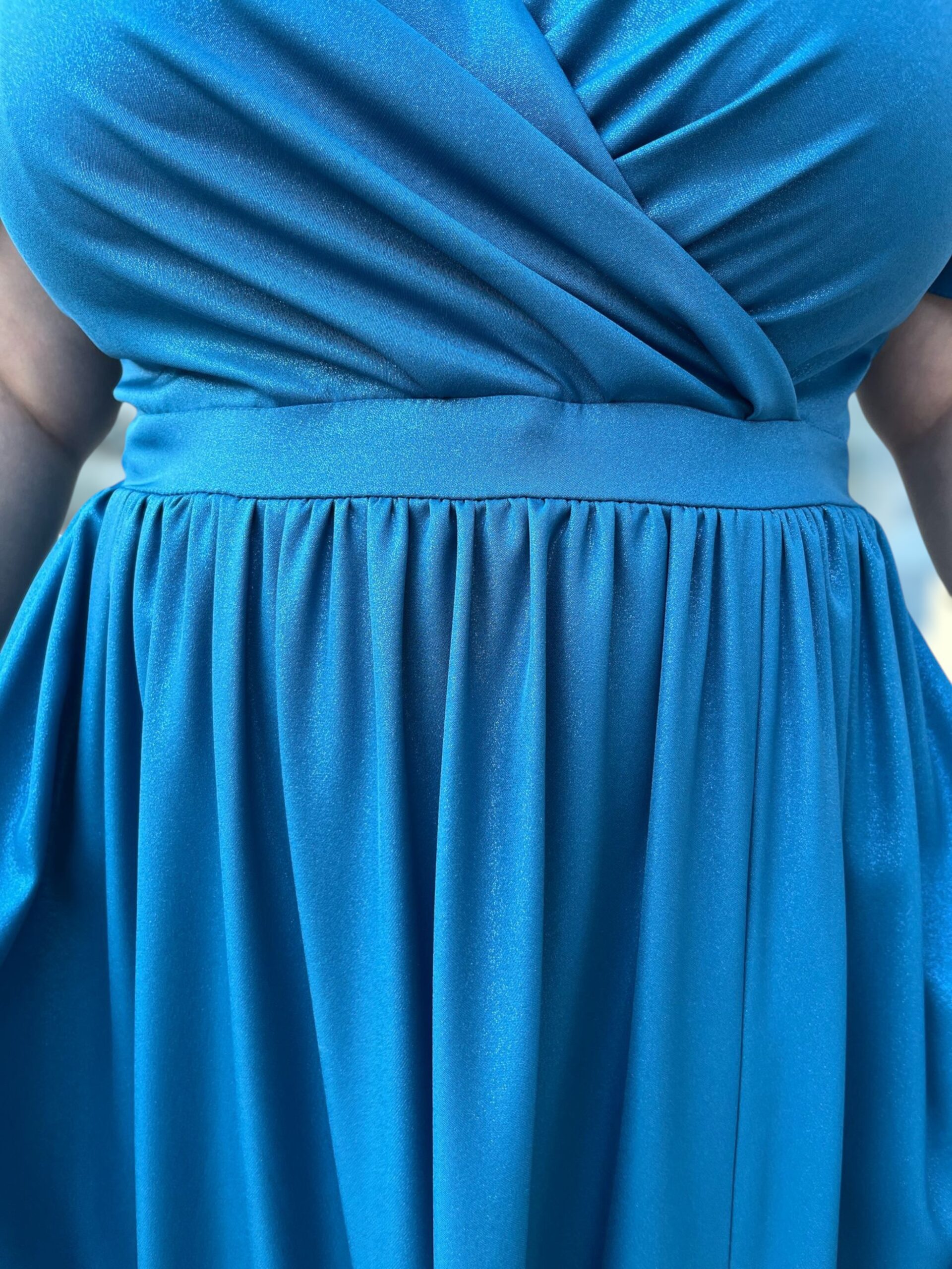 Stylowa sukienka Joanna to idealna propozycja dla kobiet ceniących elegancję i wygodę w rozmiarach plus size. Wykonana z lekkiego materiału ozdobionego delikatnym brokatowym połyskiem, który pięknie odbija światło, dodając kreacji szyku. Sukienka posiada kopertowy dekolt, podkreślający biust, oraz elastyczną talię, która zapewnia doskonałe dopasowanie do sylwetki.