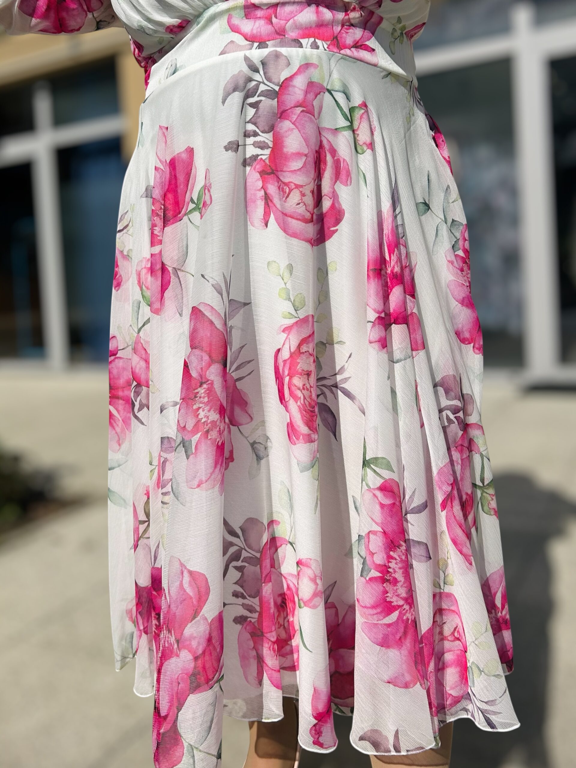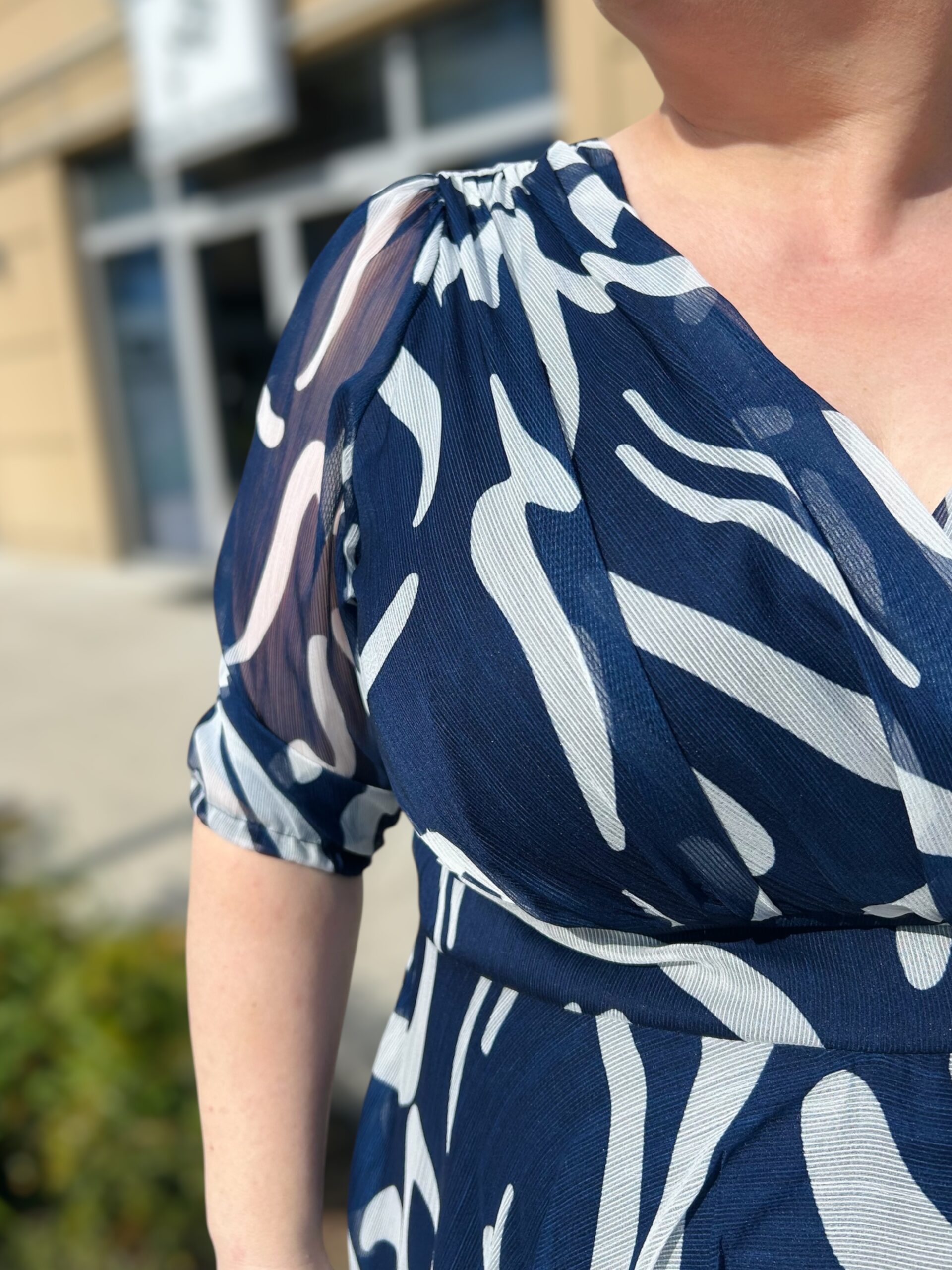 Rękawy ¾ z lekko marszczoną główką dodają całości lekkości i równoważą proporcje figury. Długość midi – sięgająca do połowy łydki – to bezpieczna i niezwykle stylowa długość, odpowiednia na każdą okazję.