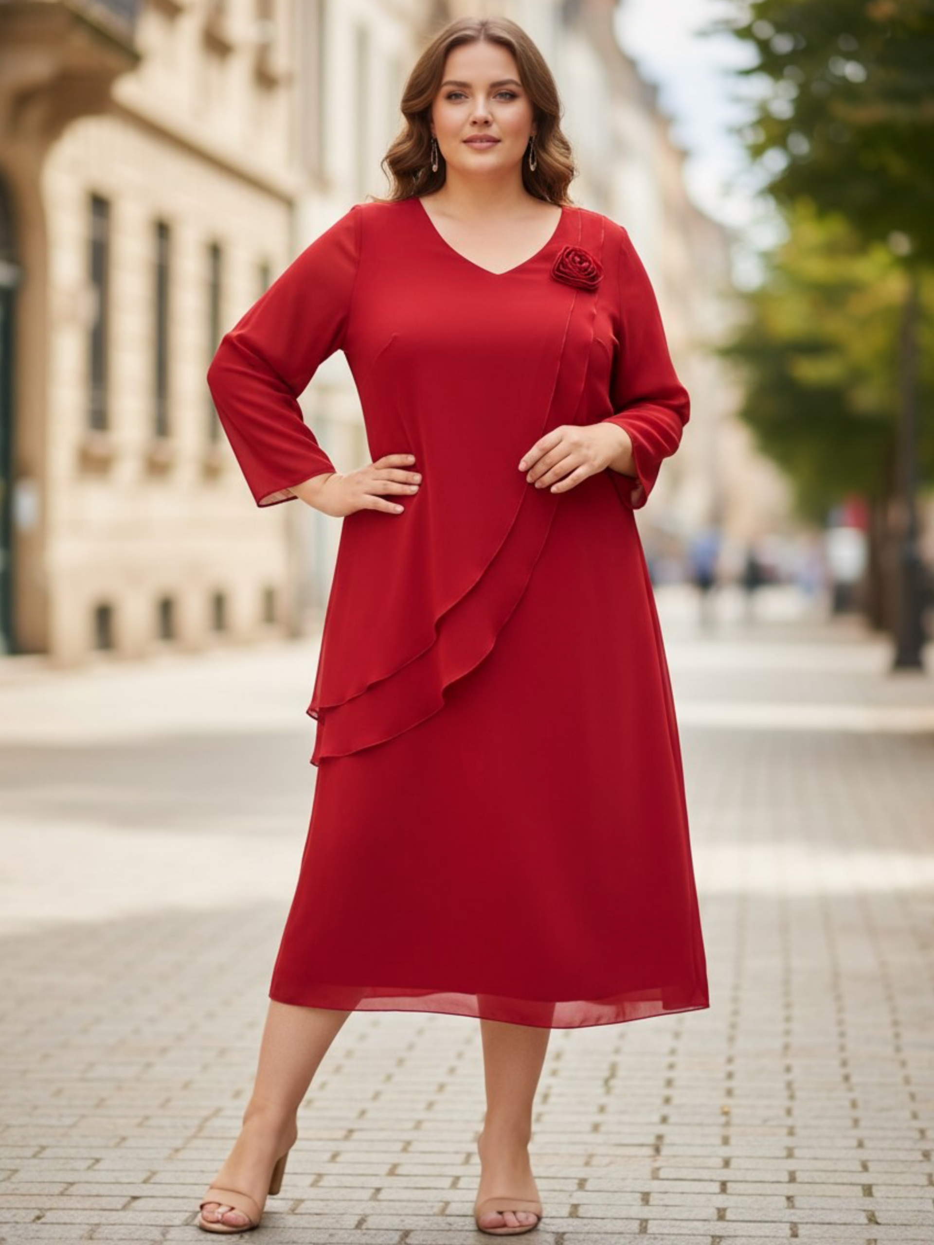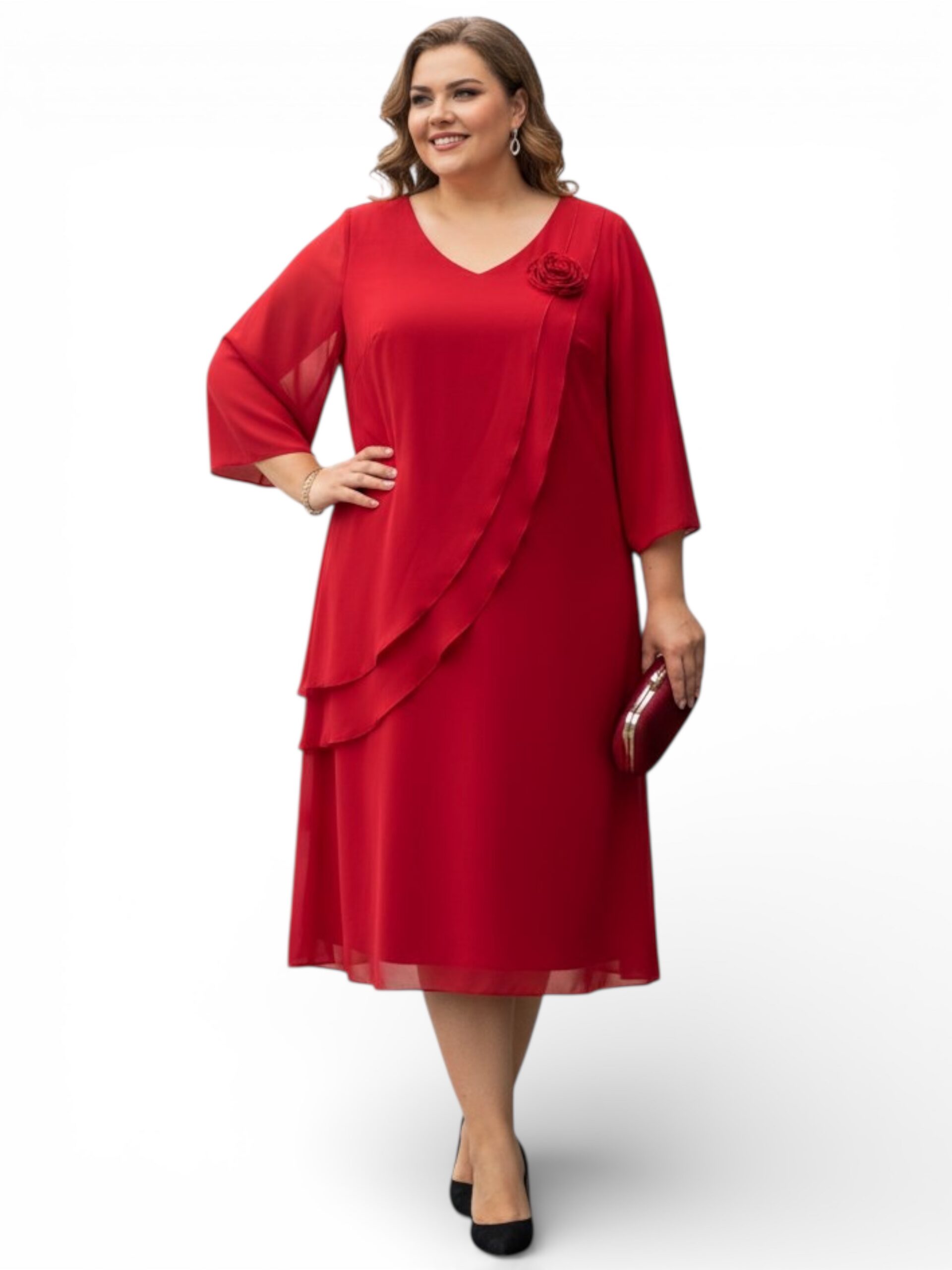 Prezentujemy wyjątkową sukienkę wizytową w dużych rozmiarach, która łączy w sobie klasyczną elegancję z nowoczesnymi detalami, idealną na każdą uroczystość. Głębokie odcienie przyciągają spojrzenia i dodają stylizacji szlacheckiego charakteru. Przemyślany fason sukienki zapewnia niezwykły komfort noszenia i pięknie układa się w ruchu. Subtelny dekolt w serek optycznie wysmukla sylwetkę, a ozdobna, materiałowa róża dodaje całości romantycznego uroku. Sukienka wykonana jest z delikatnego, lejącego materiału, gwarantuje swobodę ruchów i pewność siebie przez cały dzień.