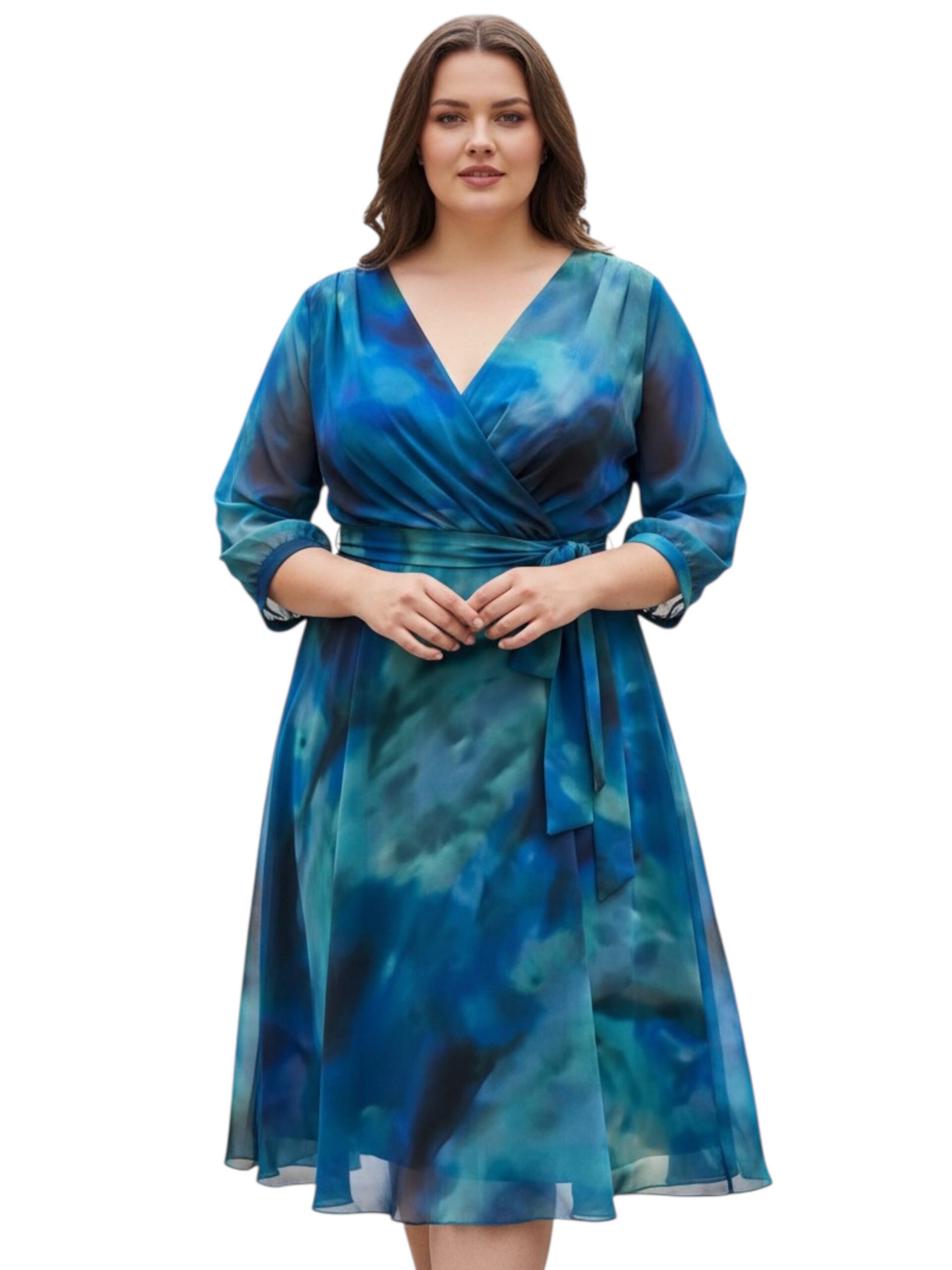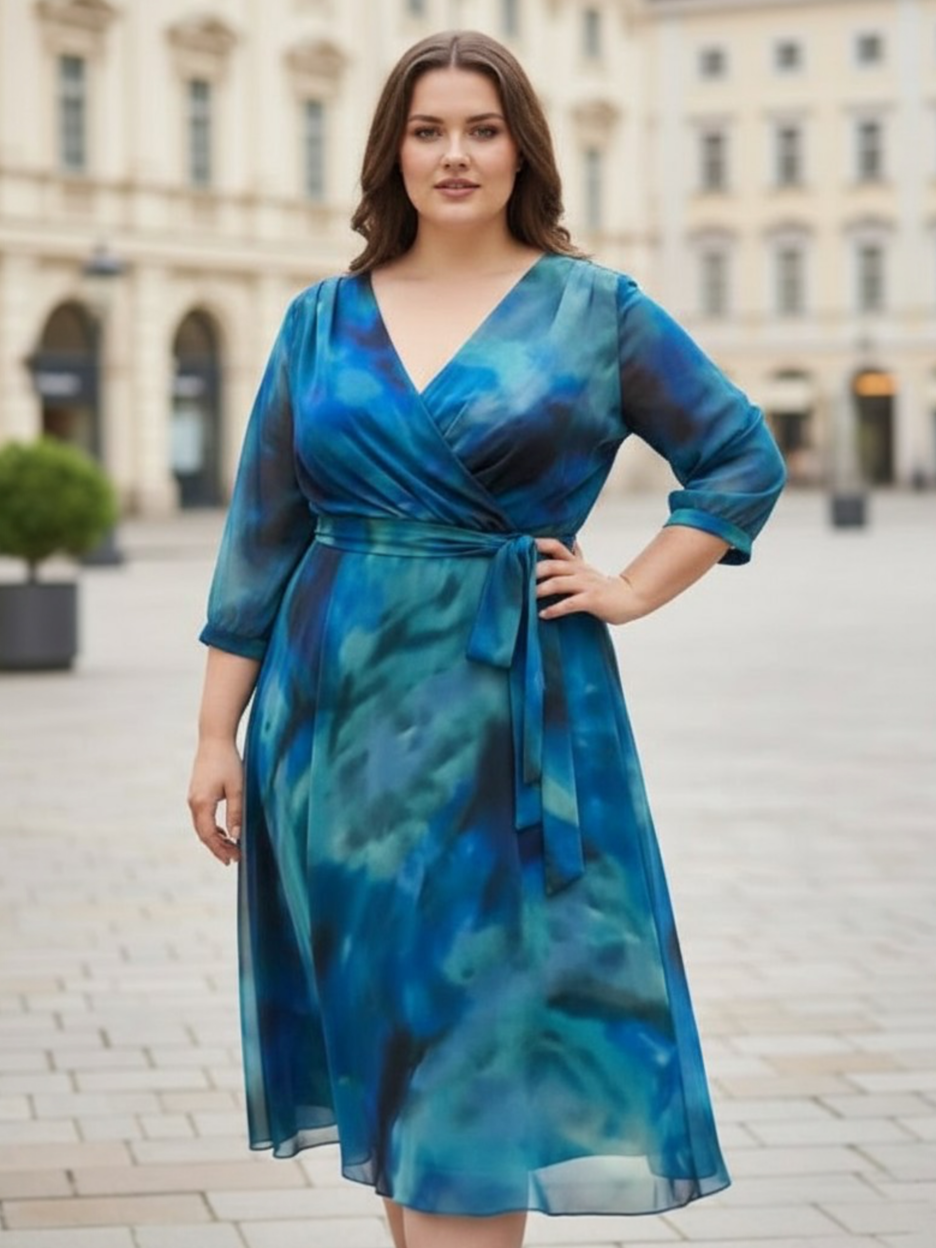 Zjawiskowa sukienka w rozmiarach plus size, która zachwyca artystycznym wzorem przypominającym akwarelowe plamy. Dynamiczna kompozycja odcieni błękitu, turkusu i głębokiego granatowego koloru przyciąga spojrzenia i dodaje stylizacji niepowtarzalnego charakteru. Kopertowy fason z dekoltem w serek, pięknie modeluje sylwetkę i podkreśla jej atuty. Wiązanie w talii pozwala na idealne dopasowanie, a zwiewne, długie rękawy dodają całości lekkości i elegancji. Wykonana z lejącej, delikatnej tkaniny, sukienka pięknie układa się w ruchu, zapewniając niezwykły komfort noszenia. To sukienka, w której poczujesz się pewnie i wyjątkowo.