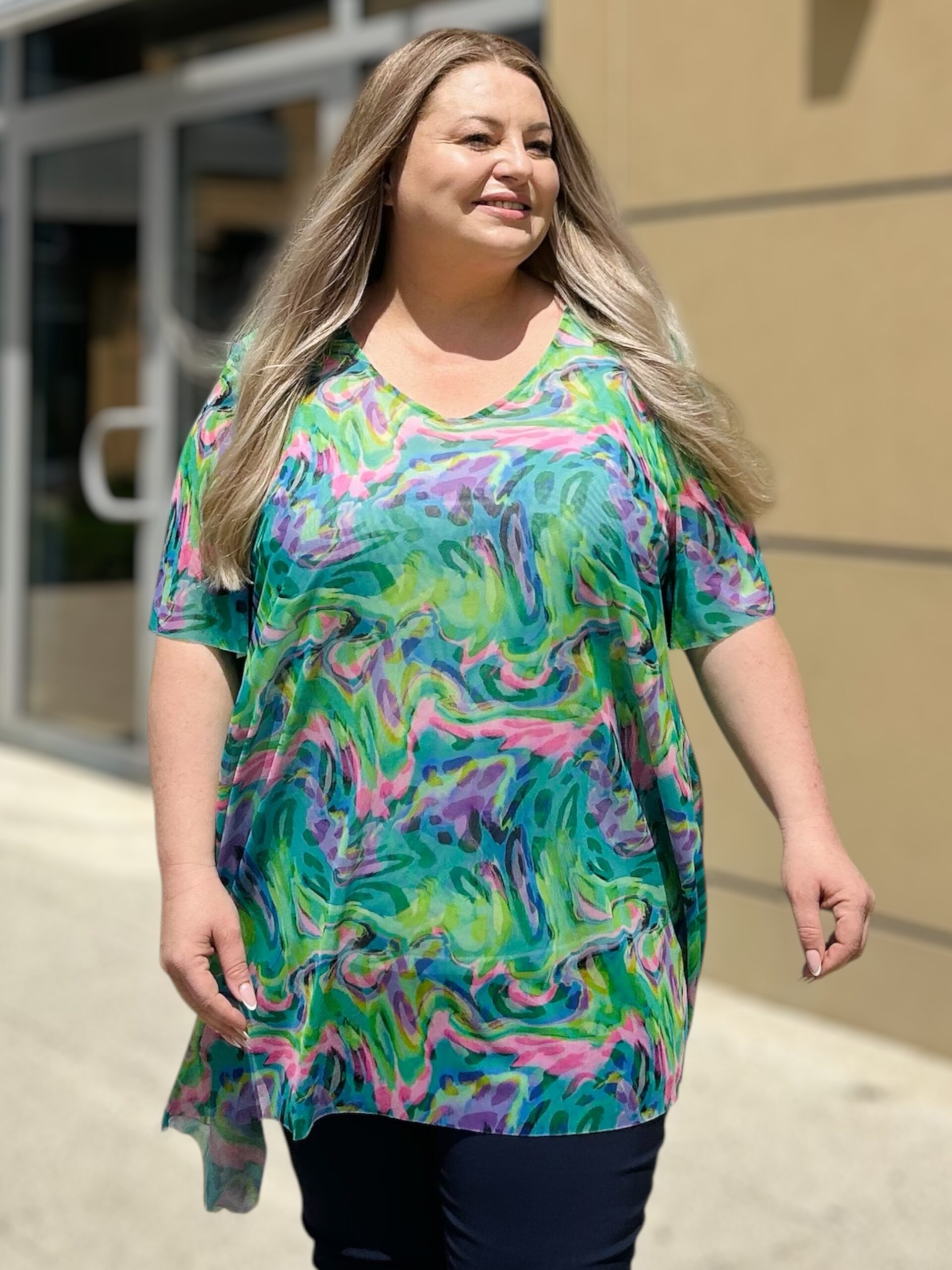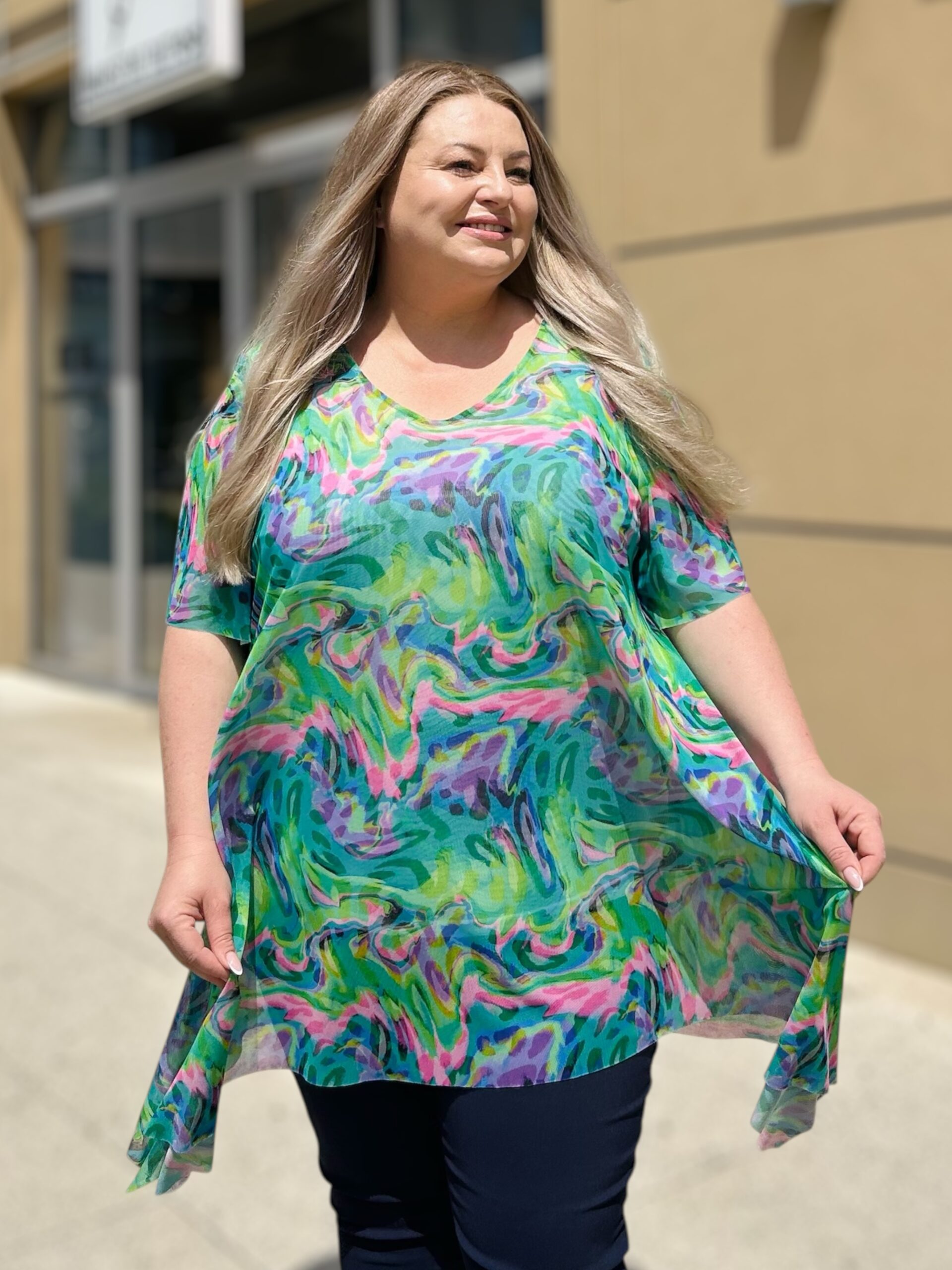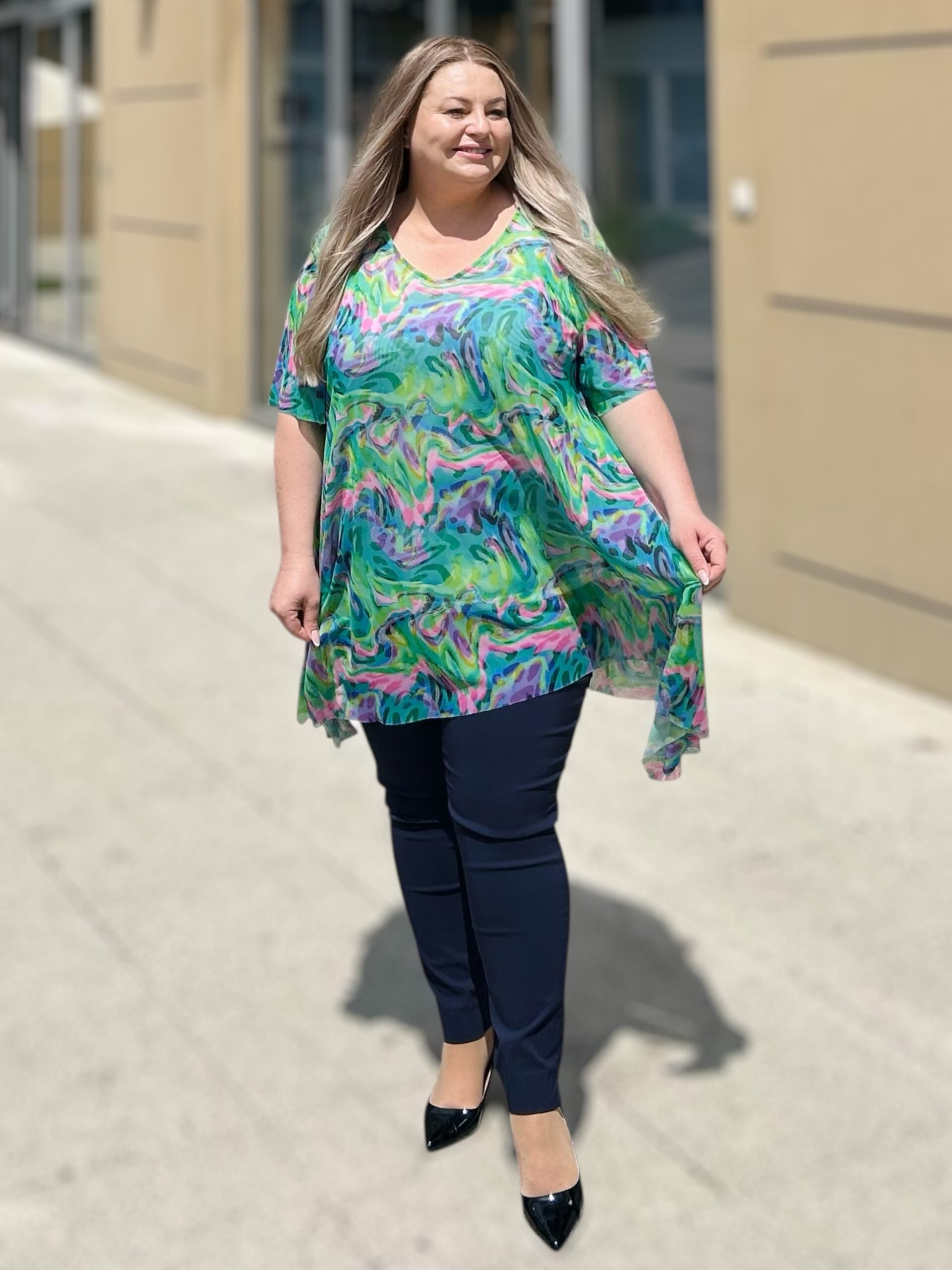 54 obwód w biuście 120-130 cm, obwód w biodrach 130-140 cm, długość 82 cm, długość rękawa 33 cm